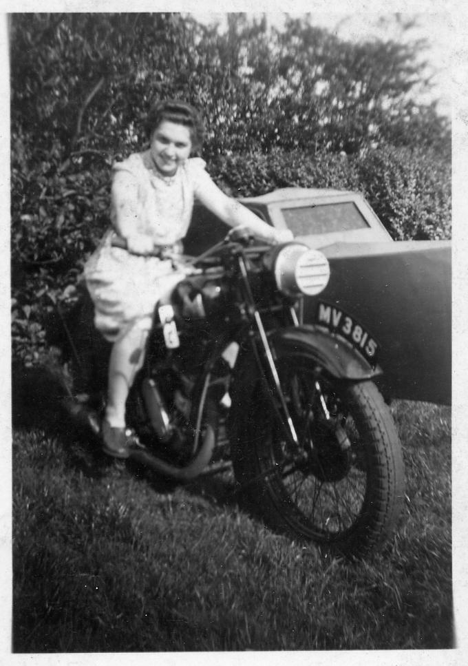 Edith Norris – undated, but probably early 1940s. Note the wartime blackout slits fitted to the motorbike headlamp.