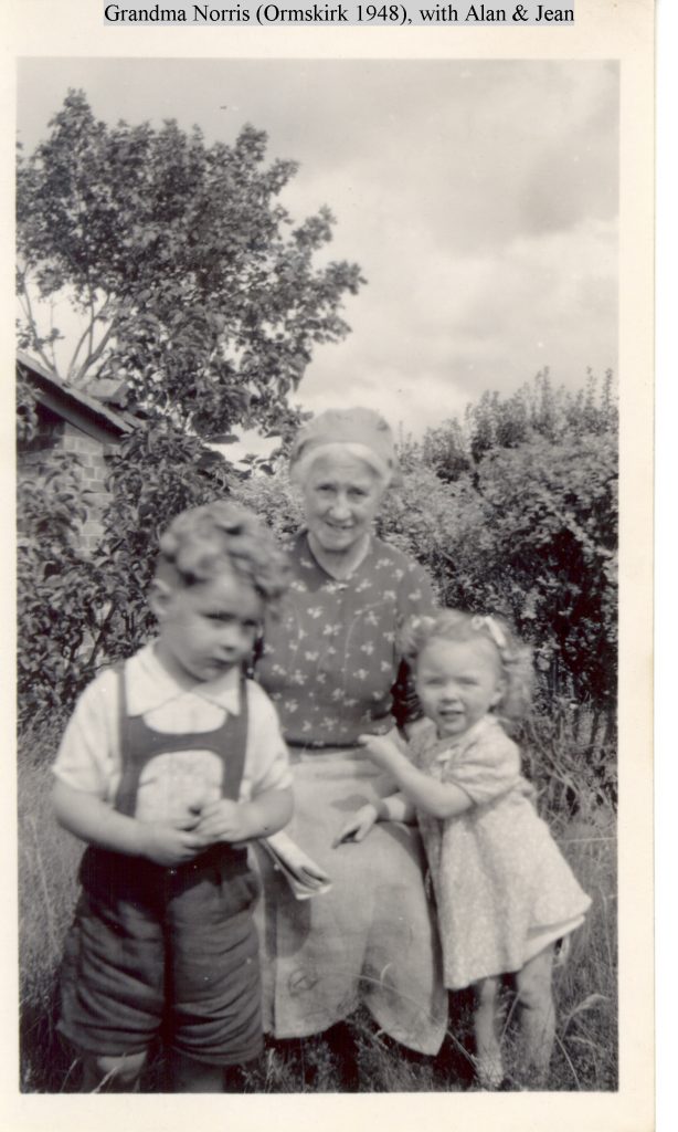 My maternal grandmother Sarah Norris, née Paterson (1881-1956), lived in a small cottage at the top of Alty’s Lane, Bickerstaffe. Here she raised three children – Henry (“Nolly”, 1916-2006), Campbell (1917-1999), and my mother, Edith (1921-2004) – as a single parent following the early death of her husband, Henry Norris (1885-1926). I was born there in 1945, though we moved later that year to Manchester when my father, Charles Cooper (1913-1989) was demobbed. I remember the cottage from the late-40s/early-50s as having no gas or electricity, lit by oil lamps, and with an outdoor earth closet (toilet) in the back yard next to the old pigsty. The cottage is still there, across the fields from Edge Hill University, presumably now with updated facilities.