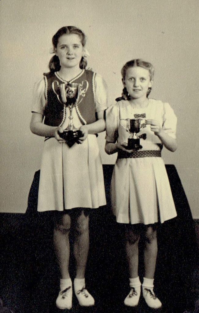 This photograph from 1950 shows Sylvia and her older sister Christine with some of their many trophies.